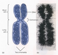 在生物的细胞核中,有一种易被碱性染料染上颜色的物质,叫做染色质。染色体只是染色质的另外一种形态。它们的组成成分是一样的,但是由于构型不一样,所以还是有一定的差别。染色体在细胞的有丝分裂间期由染色质螺旋化形成。用于化学分析的原核细胞的染色质含裸露的DNA,也就是不与其他类分子相连。而真核细胞染色体却复杂得多,由四类分子组成:即DNA,RNA,组蛋白(富有赖氨酸和精氨酸的低分子量碱性蛋白,至少有五种不同类型)和非组蛋白(酸性)。DNA和组蛋白的比例接近于1:1。