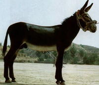 关中驴 体形外貌: 关中驴体格高大,结构匀称,体型略呈长方型。头颈高扬,眼大而有神,前胸宽广,肋弓开张良好,尻短斜,体态优美。90%以上为黑毛,少数为栗毛和青毛。 生产性能: 在正常饲养情况下,幼驴生长发育很快。1.5 岁能达到成年驴体高的93.4%,并表现性成熟。3岁时公母驴均可配种。公驴4~12岁配种能力最强,母驴终生产5~8胎。多年来关中驴一直是小型驴改良的重要父本驴种。特别对庆阳驴种的形成起了重大作用。