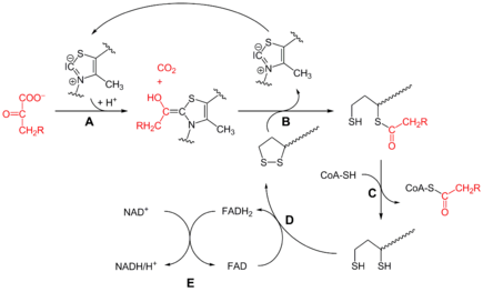 丙酮酸的简单脱羧是由丙酮酸脱羧酶所催化的,生成乙醛和二氧化碳;其反应大致可分为四步:①硫胺素焦磷酸的活性碳原子对丙酮酸的羰基碳(中间的那个碳原子)进行亲核攻击,羰基氧与质子结合变成羟基;②羧基从此共价化合物上脱去生成二氧化碳,形成了共振稳定的碳负离子化合物;③碳负离子被氢离子质子化,形成羟乙基硫胺素焦磷酸;④羟基去质子化,硫胺素与羟乙基两者之间的共价键断开形成乙醛。