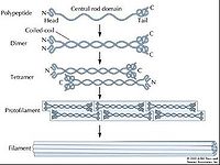 与微管和微丝相比, 中间纤维在结构和功能上至少有三方面的差异。首先, 中间纤维是相当稳定的结构,即使用含有去垢剂和高盐溶液抽提细胞, 中间纤维仍然保持完整无缺。第二, 中间纤维在体积上与微管和微丝是不同的, 微管是直径是24nm, 微丝是7nm, 而中间纤维是10nm。而且形态上也不相同, 微管是由αβ微管蛋白二聚体组装成的中空管状, 微丝是由球形亚基装配成的α螺旋纤维, 而中间纤维的亚基是α-螺旋杆状装配成似杆状的结构。第三,IFs的亚基并不同核苷酸结合, 而微管的亚基与GTP或GDP结合, 微丝的亚基则与ATP或ADP结合,但是对于中间纤维装配的许多细节尚不清楚。