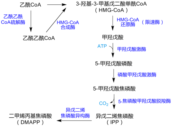 它由硫解酶合成两分子乙酰辅酶A而来,再由β-羟-β-甲戊二酸单酰辅酶A合酶与一分子乙酰辅酶A合成HMG-CoA。而在亮氨酸的代谢过程中,上述反应按相反方向进行。