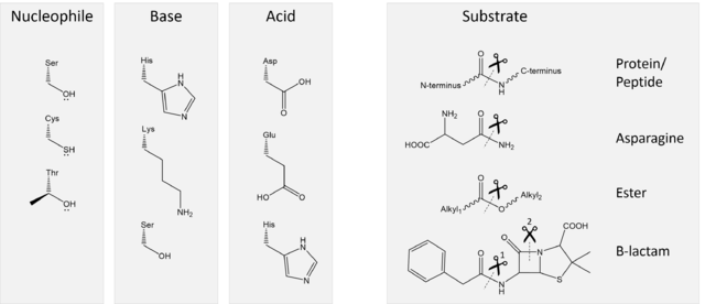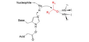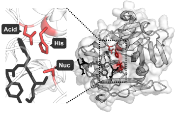 侧链上的亲核残基可共价催化底物。氧或硫上的孤对电子会进攻正电的羰基碳。20种天然生物氨基酸没有足够的亲核性官能团以催化许多困难的反应。最常见的亲核体是丝氨酸的醇(OH)和半胱氨酸的硫醇/硫醇盐离子(SH/S-)。在三联体中嵌入亲核体提高了它的催化活性。一些蛋白酶采用的是苏氨酸的仲醇,然而由于额外甲基的缘故,这些蛋白酶使用N端氨基附近的一个水分子作为碱,而不是一个单独的氨基酸[1][16]。