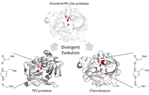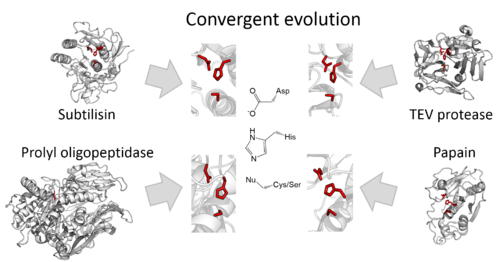 对蛋白酶的酶学研究为趋同演化理论提供了最清晰的证据。在不同的超家族中,具相同排列和结构的三联体曾经历了超过20次的独立演化。这是因为虽然酶作为一种蛋白质,其氨基酸排列方式有无数种,但是其中只有按照少数几种方式排列才能形成具有催化作用的酶——化学性质使然。这导致了具有相同结构的酶被各种生物重复地、独立地演化出来。[1][2]