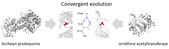 有数个属于不同蛋白质折叠类的酶超家族独立演化出了以N端苏氨酸残基作亲核试剂的三联体,包括PB超家族(蛋白酶体运用Ntn折叠)[19]和PE超家族(乙酰基转移酶运用DOM折叠)。[20]这种不同折叠类的酶在活性中心结构上的共同点表明在这些超家族中,活性中心是趋同演化的。[2][16]