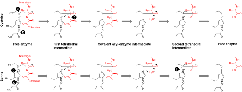 半胱氨酸蛋白酶的几个家族使用这个三联体组,例如烟草花叶病毒蛋白酶(PA超家族,C4家族)和木瓜蛋白酶(CA超家族,C1家族)。其作用类似于丝氨酸蛋白酶中的三联体,它们之间的差异将在下文“丝氨酸和半胱氨酸水解酶机制的比较”一节中阐述。目前尚不清楚天冬氨酸对木瓜蛋白酶中三联体的催化作用和几种半胱氨酸蛋白酶(如甲型肝炎病毒蛋白酶)中二分体的高效性有何重要作用。