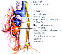 3.将上叶及下叶肺向后方牵开,暴露出肺门前缘。先将浅面的肺上静脉分出,分别结扎并切断上叶静脉及中叶静脉(图3、4)。
