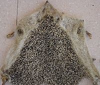 一年四季都可捕捉,趁刺猬冬眠时候捕捉更为方便,捉到后用脚紧踏刺猬,使它四肢伸开,然后用快刀纵剖腹部,割去四爪,用力挤出内脏,剥去肌肉,取皮翻开,使刺毛向里,挂通风处阴干,刺猬皮不能太阳晒,以免皮内脂肪溶化走油,影响质量,干后即为成品。