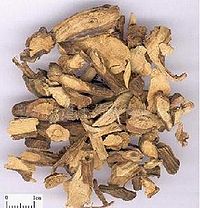 性状 根茎圆柱形,弯曲,有分枝,长可达50cm,直径0.3~0.8cm。表面黄棕色至暗棕色,多有弯曲的细根及纵皱纹,外皮易剥落。质韧,不易折断,断面不整齐,纤维性,木部淡黄色,呈放射状排列,中心有髓。气微,味苦。