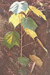 【植物形态】翻白叶树,乔木,高可达20米。小枝被红色或黄色茸毛。叶异型,革质;幼树或萌发枝上的叶盾形,长约20厘米,掌状3-5深裂;成长树上的叶长圆形或卵状长阙形,长7-15厘米,宽3.5-8厘米,先端渐尖,或短尖,基部钝形、截形或斜心形,上面无毛,下面密被黄褐色茸毛;叶柄长1-2厘米;托叶线状长圆形。花脓生、单生成2-4朵聚生;小苞片2-4,全缘;萼片5,狭披针形,长2-2.5厘米,宽2-3毫米;花瓣5,白色;雄蕊15,每3个合成1束,与5个退化雄蕊互生;子房5室,被毛。蒴果木质,狭卵形,长4-5厘米,密被锈色星状柔毛。花期8月。生于砂质土山坡、平原、丘陵地疏林或密林中。分布广东、广西、福建、台湾。