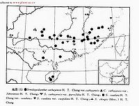 广东:乳源、大埔、东山、信宜、乐昌、梅县、英德、连山、温塘山。广西:临桂、灌阳、大瑶山、贺县,龙胜、大苗山、永福、上思。海南:保亭、琼中、陵水、乐东。福建:漳平、永春、龙岩、南靖、南平、沙县。湖南:宜章、资兴。浙江:景宁、泰顺。贵州:雷山、榕江、荔波、册亨、赤水、贵阳。江西:石城、瑞金、龙南、全南、寻乌、安远。