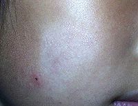 皮肤浅,呈苍白色,表面干燥,附有少量细碎灰白色鳞屑。基底炎症轻微或缺乏,损害可逐渐扩大,邻近者可相互融合。自觉微痒或无自觉症状,皮损好发于颜面,尤其是双颊及额部,亦可见于颈部、躯干及四肢。损害可自然消退,遗留轻度色素减退,病程缓慢,数月以至1年,鳞屑消退后,白斑尚持续年余。该病多见于儿童或青少年,春季发生较多,亦可见于初夏及冬季。.