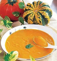 2.紫菜南瓜汤老南瓜100克,紫菜10克,虾皮20克,鸡蛋1枚,酱油、猪油、黄酒、醋、味精、香油各适量。先将紫菜水泡,洗净,鸡蛋打入碗内搅匀,虾皮用黄酒浸泡,南瓜去皮、瓤,洗净切块;再将锅放火上,倒人猪油,烧热后,放人酱油炝锅,加适量的清水,投入虾皮、南瓜块,煮约30分钟,再把紫菜投入,10分钟后,将搅好的蛋液倒入锅中,加入作料调匀即成。此汤具有护肝补肾强体之功效,适宜于肝肾功部不全患者食用。