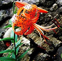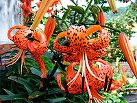 卷丹,又称虎皮百合。卷丹花瓣有平展的,有向外翻卷的,故有“卷丹”美名。将其地栽于庭院则夏季可观赏花朵,秋季可食用鳞茎,因此具有较高的实用价值。在中国主要用作食用百合。其鳞茎含有大量的淀粉和蛋白质,可以做蔬菜食用。