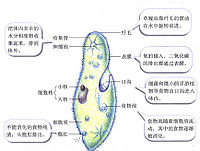 草履虫以细菌和有机碎屑为食,对不同种类的细菌有选食性。食物泡随细胞质流动而在泡内逐步消化,不能消化的残渣通过表膜上开口的胞肛排出体外。渗透压是靠前后两个伸缩泡交替伸缩、排出多余水分而调节的。在表膜下面整齐地埋藏许多刺丝泡。当草履虫受到强烈刺激(如化学药物、电、机械等)或敌害时,在 2 ~ 3 微秒内即可射出刺丝泡,变成一根长约 40 微米的细丝,前端有矛状小针,作为防御之用。草履虫靠体纤毛的摆动在水中游动,身体按纵轴的反时针方向旋转前进。遇障碍物或微弱刺激时 , 纤毛会朝相反方向击打 , 于是虫体改变游动路线以避开不利境地。身体中部有大、小核。无性生殖是简单的横分裂,有性生殖为接合生殖。