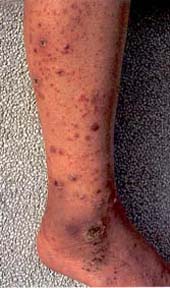 临床表现多种多样,常见有发热、焦虑、全身不适、肌痛、关节痛,但典型关节炎少见。突出损害为皮肤血管炎,表现为等麻疹、丘疹、出血性丘疹、淤斑、结节、水疱、大疱、皮肤糜烂和溃疡或复发性等麻疹。病人常感皮肤瘙痒,针刺样或烧灼性疼痛。病变以下垂部位如下肢和骶部突出。某些病人可伴有皮肤外血管炎,以关节和肾脏受累多见,患者关节痛,可出现血尿和蛋白尿,少数病人呈肾功能衰竭。胃肠道症状有腹痛、出血,以Henoch—Scloonlein紫癜为突出。也可有外周神经病变。肺部血管受累在胸部。
