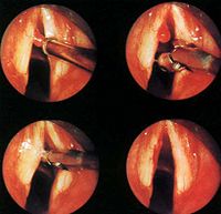 较大或已纤维化的声带小结和长期声带息肉患者,经过声带休息、发声训练和药物治疗无效时,应采取手术的方法进行治疗。目前,患者可采用的手术方法主要有:①在局部麻醉下通过间接喉镜将声带小结或声带息肉切除;②在光导纤维喉镜下运用等离子将声带小结或声带息肉去除。由于早期的声带癌和有些声带息肉用肉眼难以鉴别。因此,对切除的声带息肉应作相应的病理检查。对在局部麻醉下不能配合治疗的患者,应采取全身麻醉的方法对其进行手术治疗。③支撑喉镜下切除术。手术要注意如果双侧声带前部粘膜不能同时损伤,否则可造成声带粘连。 术后应禁烟,纠正不良的发音习惯,否则易复发。