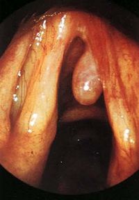 声带息肉是指发生于一侧声带的前中部边缘的灰白色,表面光滑的息肉样组织,多为一侧单发或多发,有蒂或广基,常呈灰白色半透明样,或为红色小突起,有蒂者常随呼吸上下移动,大者可阻塞声门发生呼吸困难,影响发音。位置多位于声带前中三分交界处,一般小儿出现声带小结可以暂不要处理,成人出现小结或者息肉一般要通过手术才能治疗。手术后应常规禁声并可以做雾化治疗,同时注意发音方法及避免过度发声,以防复发。