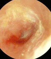 3.晚期(穿孔期):鼓室积脓增加,鼓膜毛细血管受压,出现小静脉血栓性静脉炎,局部坏死溃破。致鼓膜穿孔,脓液由此外泄。由于脓液得以引流,局部症状和全身症状亦随着改善,耳痛减轻,体温下降。耳漏初为血水样,后为粘脓性或脓性。