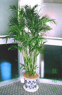 靠根茎上,盆栽时,因较原来栽的稍深些,以免新芽更好地扎根。5~10月是其生长旺盛期,必须提供 比较充足的水肥条件。平时保持盆土经常湿润。夏秋高温期,还要经常保持植株周围有较高的空气湿度,但切忌盆土积水,以免引起烂根。一般每1~2周施一次腐熟液肥或复合肥,以促进植株旺盛生长,叶色浓绿,秋冬季可少施肥或不施肥,同时保持盆土干湿状态。散尾葵喜温暖,冬季需做好保温防冻工作,一般10℃左右 可比较安全越冬,若温度太低,叶片会泛黄,叶尖干枯,并导致根部受损,影响来年的生长。它喜半阴,春、夏、秋三季应遮阴50%。在室内栽培观赏宜置于较强散射光处;它也能耐较阴暗环境,但要定期移至室外光线较好处养护,以利恢复,保持较高的观赏状态。如果环境干燥、通风不良,容易发生红蜘蛛和介壳虫,故应定期用800倍氧化乐果喷洒防治。