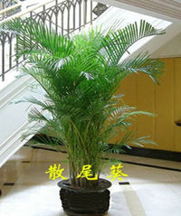 散尾葵形态潇洒优美,性耐阴,在明亮的室内可长时间地陈设观赏,在较暗的环境也可连续摆放4-6周,是深受欢迎的高档观赏植物,冬季注意保暖。棕榈科丛生常绿热带灌木。叶羽状披针形,先端柔软。姿态优美婆娑,适宜室内摆放。枝条开张,枝叶细长而略下垂,株形婆娑优美,姿态潇洒自如,是著名的热带观叶植物。它较耐阴,适合于室内绿化装饰。一般中小盆可布置客厅、书房、卧室、会议室等,可供较长期观赏。在较阴暗的室内连续观赏1-2个月,仍可保持较好的观赏状态。大株种植于木桶,布置于大楼门厅、大堂等处,可体现热带凤光。属常绿灌木,原产于马达加斯加岛,喜温暖、多湿及半阴环境,耐寒力较弱。