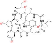 该类化合物具有相似结构,都是由8个氨基酸残基构成的环肽,其中的色氨酸(或6-羟色氨酸)与氧化的半胱氨酸桥连,形成一个双环的结构。目前已知有十种毒伞肽:[1]