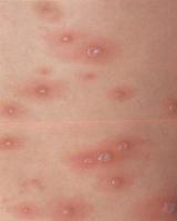 起病较急,可有发热、倦怠、食欲减退等全身症状,成人较儿童明显,一般1~2天内发疹。首先发于躯干,逐渐延及头面部和四肢,呈向心性分布,即躯干多,面部四肢较少,手掌,足跖更少。初起为红色小丘疹,数小时后变成绿豆大小的水疱,周围绕以红晕。水疱初呈清澈的水珠状,壁薄易破,伴有瘙痒。经2~3天而干燥结痂,以后痂脱而愈,不留疤痕。在发病3~5天内,皮疹陆续分批发生,故同时可见丘疹、水疱、结痂等不同时期的皮损,病程约 2~3周。