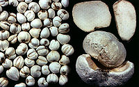 【采集】5~6月采挖,洗净泥土,大小分开,大者摘去心芽,分作2片,呈元宝状,称元宝贝,小者称珠贝。分别置擦笼内,擦去外皮,加石灰拌匀,经过一夜,使石灰渗入,晒干或烘干。