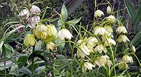 花单生于茎顶或叶腋,花梗长1~1.5厘米;花钟形,俯垂;花被6片,2轮排列,长椭圆形,先端短尖或钝,淡黄色或黄绿色,具细微平行脉,内面并有淡紫色方格状斑纹,基部具腺体;雄蕊6,花药基部着生,外向;雌蕊1,子房3室,每室有多数胚珠,柱头3歧。