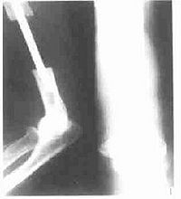 (1)周围型骨纤维肉瘤:好发长骨干骺端及骨干,很少引起跨关节破坏,但骨质破坏较恶性滑膜瘤明显,且出现的钙化率低。