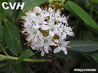 【原形态】半常绿灌木,高1-2m。小枝细瘦,黄褐色,疏生鳞片及柔毛,老枝灰色,纵裂。单叶互生;叶柄长3-7mm;叶片革质,椭圆状披针形或狭卵形,长3-6cm,宽8-15mm,先端钝或稍尖,基部渐狭呈楔形,边缘略反卷,有疏浅齿或不明显的细齿,表面绿色,光滑,背面淡绿色,密生褐色鳞片。花密集成总状花序顶生;花小,乳白色;花萼5深裂,裂片狭三角形至披针形,有睫毛;花冠钟形,长6-8mm,5裂,裂片卵形,外侧有鳞片;雄蕊10枚,伸出花冠外;雌蕊1,子房5室,有鳞片,花柱短于雄蕊。蒴果圆柱形,长4-8mm,褐色,成熟时5裂,花柱宿在。花期5-7月,果期7-9月。