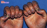 甲营养不良(nail dystrophy):是一种多因素引起的甲损害。常累及所有指,趾甲。患者指(趾)甲变薄,浑浊,变形,易碎。甲表面失去光泽,粗糙。常有纵嵴及甲剥离。真菌镜检阴性。无有效治疗方法。部分患者病情随年龄增长逐渐缓解。
