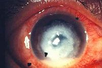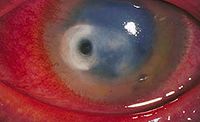 真菌性角膜炎在临床上较难诊断,容易误诊,常因治疗不当而造成失明。一般情况下,真菌不会侵犯正常角膜,但当有眼外伤、长期局部使用抗生素、角膜炎症及干眼症等情况时,非致病的真菌就可能变为致病菌,引起角膜继发性真菌感染。常见的致病菌为曲霉菌,其次是镰刀菌、白色念珠菌、头芽孢菌及链丝菌等。真菌性角膜炎起病缓慢、病程长,病程可持续达2至3个月,常在发病数天内出现角膜溃疡。因致病菌种不同,角膜溃疡形态不一。 真菌性角膜炎并非少见。夏秋农忙季节发病率高。在年龄与职业上,多见于青壮年、老年及农民。