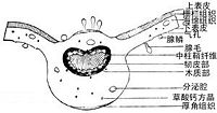 该品茎的横切面:表皮细胞壁厚,有腺毛;老茎可见木栓层。皮层较宽,外侧为数列厚角细胞;有的含草酸钙方晶;具分泌腔。内皮层明显。韧皮部甚窄,外侧有少数纤维。形成层环不明显。木质部细胞均木化,导管多单行排列。髓部较大,具分泌腔。薄壁细胞含草酸钙方晶及淀粉粒,有的含棕色物。