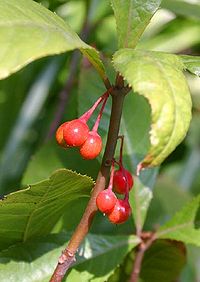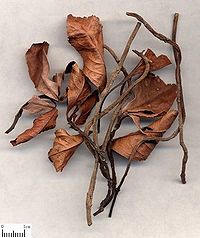 该品根茎呈圆柱形,疏生须根。茎略呈扁圆柱形,稍扭曲,长10~30cm,直径0.2~0.5cm;表面红棕色,有细纵纹、叶痕及节;质硬,易折断。叶互生,集生于茎梢;叶片略卷曲或破碎,完整者展平后呈椭圆形,长3~7cm,宽1.5~3cm;灰绿色、棕褐色或浅红棕色;先端尖,基部楔形,边缘具细锯齿;近革质。茎顶偶有红色球形核果。气微,味微涩。