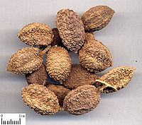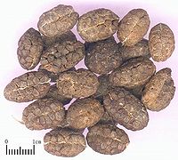 (3)海南砂仁果实卵圆形、椭圆形、梭状椭圆形或梨形,具有明显的3钝棱,长1-2cm,直径0.7-1.7cm,表成灰褐色或灰棕色,被片状、分枝的短刺;果皮厚而硬,内表面多红棕色;每室含种子4-24颗,种子多角形,长2.5-4mm,直径1.5-2mm,表面红棕色或深棕色,具不规则的皱纹。气味稍淡。以个大、坚实、仁饱满、气香浓者为佳。