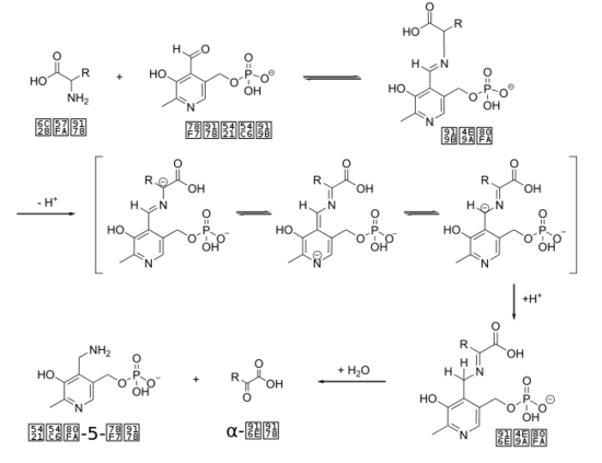 磷酸吡哆醛在所有转氨基作用反应以及一些氨基酸的脱羧与脱氨反应中充当辅酶的角色。磷酸吡哆醛的醛基与氨基转移酶中特定赖氨酸基团的ε-氨基之间形成希夫碱键(内部醛亚胺)。氨基酸底物中的α-氨基置换活性位点赖氨酸残基的ε-氨基。生成的外部醛亚胺变得去质子化而形成一个醌型中间体,后者转而在不同的位置上接受一个质子以形成一个酮亚胺。酮亚胺水解,使复合酶的氨基得到再生[2]。