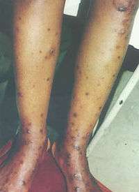 【临床表现】多见于成年女性,好发于四肢身侧及手足背部。初起为数目不定的淡红色丘疹,逐渐扩大到黄豆至蚕豆大小红褐色或灰褐色半球形结节。表面粗糙呈疣状,阵发性剧痒,因搔抓而有色素沉着及苔藓样变。慢性病程。