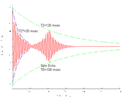 以右图的例子为例:TE为100毫秒,T2为120毫秒,则自旋回讯(最高峰)的强度衰减至原来FID的