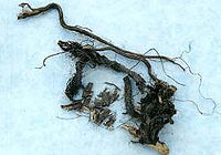 【药材】干燥根呈不规则圆柱形或稍带扁圆形,略弯曲,长6~10厘米,直径,1~2厘米。 外皮灰棕色,极粗糙。 有突起的根痕和许多疣状凸起,皮部有时脱落而呈现棕褐色或棕黄色的纤维状。 质硬体轻,断面纤维性,略有粉质,嫩者实心,有时可见中间有数个同心环纹,老者空心。 气微,味淡,嚼之略有粘性。 以灰棕色、条匀、坚实者为佳。主产江苏、山东、陕西等地。