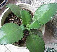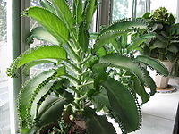 宽叶落地生根是最常见的多浆植物。其叶片肥厚多汁,边缘长出整齐美观的不定芽,形似一群小蝴蝶,飞落于地,立即扎根繁育子孙后代,颇有奇趣。用于盆栽,是窗台绿化的绿化的好材料,点缀书房和客室也具雅趣。
