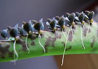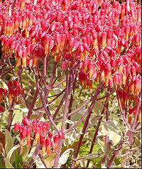 株高50-100cm,茎单生,直立,褐色。叶交互对生中,叶片肉质,长三角形,叶长15-20cm,宽2-3cm以上,具不规则的褐紫斑纹,边缘有粗齿,缺刻处长出不定芽。复聚伞花序、顶生,花钟形,橙色。