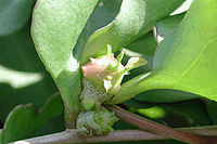 芽和侧芽,芽具肉质鳞片,可长枝着叶,形成花序或单花。叶互生,具柄;叶片肉质,心形、宽卵形至卵圆形,长4-8cm,宽4-9cm,先端凸尖,稍圆形或微凹,基部心形、楔形或圆形,全缘,平滑而带紫红,间见叶面扭曲而呈波状,主脉在下面微凹,上面稍凸。总状花序腋生或顶生,单一或疏生2-4个分枝,花序轴长10-30cm,花数十朵至200余朵;花梗长2-4mm,基都有一披针形、先端锐尖的苞叶;花基合生呈杯状的苞片2,其上有与其交互对生的宽卵形或椭圆形小苞片2枚,较花被片短;花被片卵形或椭圆形,长约3mm,宽约2mm,白色;雄蕊比花被长,花丝基部宽而略联合,在蕾中时外折;子房近球形,上位,花柱上部3裂,柱头乳头状。花芳香,开后变黑褐色,久不脱落。花虽两性,但通常不孕。果未见。花期6、7月起可开放半年。