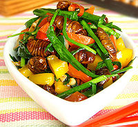 洗净备用。炒锅置火上放入油,将沥净水的蚕蛹略炒,再放入韭菜段,加入姜末、精盐、味精翻炒均匀即可装盘上桌。可补气养血温肾助阳,消除疲劳抗衰老。适于高血脂、高血压、动脉硬化、阳痿遗精、便秘等患者食用。