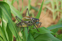 2、暗褐蝈螽:体形同于优 蝈螽,翅面具草绿色,条纹并布满褐色斑点,呈花翅状,故也有“花叫”叫声:“吱拉,吱拉”。