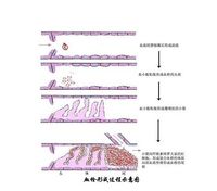 无论心或动脉、静脉内的血栓,其形成过程都从血小板粘附于内膜裸露的胶原开始。当内源性和外源性凝血途径启动后最后产生的凝血酶将纤维蛋白原水解,其纤维蛋白单体再聚合成纤维蛋白多聚体(纤维素)。纤维素和内皮下的纤维连接蛋白共同使粘集的血小板堆牢固地粘附于受损内膜表面,不再离散,形成境下均匀一致、无结构的血小板血栓,电子显微镜下,血小板彼此紧密接触,轮廓仍然保存,但内部颗粒已消失。在血小板与血小板之间有少量纤维素存在。血小板粘集堆的形成是血栓形成的第一步,嗣后血栓形成的过程及血栓的组成、形态、大小都取决于血栓发生的部位和局部血流速度)。血管内膜粗糙,血小板粘集成堆,使局部血流形成漩涡,血小板继续粘集形成多数小梁,小梁周围有白细胞粘附,小梁间形成纤维素网,网眼中充满红细胞,血管腔阻塞,局部血流停滞,停滞之血液凝固。血栓形成过程示意图