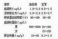 3.1986年Bassett等提出:肝铁指数(hepaticironindex)=μmol铁/g肝干重量÷年龄,对鉴别纯合子与杂合子、酒精性肝病与小量铁浓度随年龄增长而增加的鉴别有一定意义。正常时肝铁指数在1.0左右,血色病纯合子均大于2.0,杂合子与酒精性肝病均小于1.8,血色病杂合子比酒精性肝病更低。