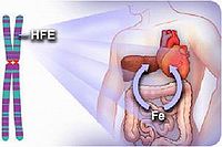 遗传性血色病的发病机制可能与HFE基因突变,转铁蛋白-转铁蛋白受体机制紊乱有关。HFE基因原称为HLA-H。但后者有相似的名称,故现称之为HFE基因。HFE基因结构与MHCⅠ类家族相似,它是MHC样Ⅰ类蛋白质,含321个氨基酸,细胞部分有α1、α2及α3三个区,与β2微球蛋白紧密相关,α1区含转铁蛋白受体结合点。 遗传性血色病是由于早年铁的吸收率增快导致组织中过多铁的积聚而逐渐发展,这是由于HFE蛋白质功能的异常,正常时HFE复合体与细胞膜上的转铁蛋白受体共同内部化。在核内体(endosome)从转铁蛋白受体—转铁蛋白—Fe3 复合体释放铁减慢。由于845A或187G等的突变,很多细胞缺乏了从血浆中限制铁摄取的正常机制,导致了铁的吸收增加,使组织与器官的实质细胞(parenchymalcell)铁的积聚。