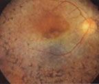 1) 视网膜色素沉着:始于赤道部,色素呈有突的小点,继而增多变大,呈骨细胞样,有时呈不规则的线条状,围绕赤道部成宽窄不等的环状排列。色素多位于视网膜血管附近,特别多见于静脉的前面,可遮盖部分血管,或沿血管分布,于血管分支处更为密集。以后,色素沉着自赤道部向后极和周边逐渐扩展,最后布满整个眼底。在此同时,视网膜色素上皮层色素脱失,暴露出脉络膜血管而呈豹纹状眼底。晚期脉络膜血管亦硬化,呈黄白色条纹。玻璃体一般清晰,有时偶见少数点状或线状混浊。