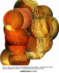 (2)囊样变性:好发于黄斑部及颞下锯齿缘附近。边缘清楚,呈圆形或类圆形,暗红色。周边部病灶呈网状,为成簇而略显高起的小红点。黄斑囊样变性呈蜂窝状。