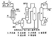 苯氧化为顺酐是在催化剂存在下进行的。常用催化剂的活性组分均为钒的氧化物(见金属氧化物催化剂),为抑制苯被完全氧化,常加入钼、磷、钛、钨、银及碱金属等元素的氧化物为添加剂,并采用低比表面的惰性物质为催化剂载体,如 α-氧化铝、刚玉等。反应在常压下进行,温度350~400℃。工艺过程由苯的氧化,顺酐的分离和提纯两大部分组成(见图)。苯蒸气和空气能形成爆炸混合物,所以进入反应器的混合气中,苯的浓度应在爆炸极限之外,一般为1%~1.4%(摩尔)。苯氧化为强放热反应,工业上常采用列管式固定床反应器,有很大的传热面,管外为冷却系统,反应热可用于产生高压蒸汽。离开反应器的气体中含顺酐约1%(摩尔),用冷却的办法可将其中所含一半左右的顺酐冷凝为液体,其余部分则用吸收法回收。吸收剂用水或惰性有机溶剂,大多数工厂采用的是水。所得到的吸收液是顺丁烯二酸的水溶液,浓度35%~40%(质量),需用共沸溶剂(例如二甲苯、苯甲醚)进行脱水,把酸重新转化成酸酐。脱水也可在膜式蒸发器中进行。粗酐经减压精馏可得成品。以苯计算,整个过程的顺酐收率为92%~96%(质量)。